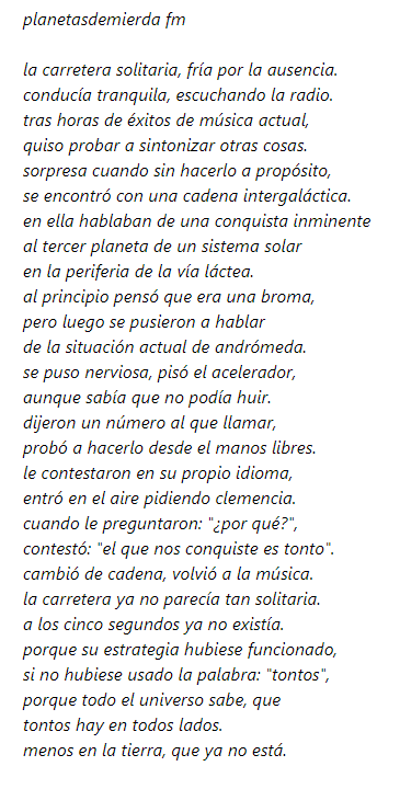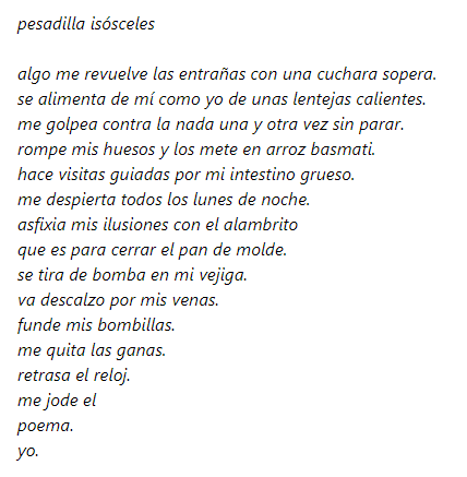 Sobre el poemario. Mañana me reúno con Pablo, y le diré: «Pablo, vamos a poner una fecha de salida al poemario». Con el único fin de poder decir el próximo domingo la fecha exacta en la que tendréis que desembolsar la cantidad exacta de 12 euros. Va todo de lujo, la verdad, y sigo firme con la idea de que no va a decepcionar a nadie (solo a mí a largo plazo). También intentaré deciros la fecha de la presentación en Madrid. Y si no sois de Madrid, seréis de otra ciudad, y si sabéis de algún sitio chulo de esa ciudad al que pueda ir (librerías, bares, asociaciones…) decídmelo para poder ir a hablar de mi libro a gente que no me conoce.