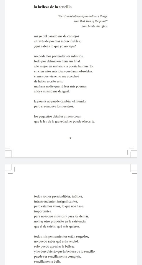 La belleza de lo sencillo & No-travel journal. Que es que, además, son dos libros en uno. ¡Y en dos idiomas diferentes! ¡Y más de cien poemas! Pero no hay ninguna letra mayúscula. Si venís buscando letras mayúsculas, en este libro (quitando la portada) no hay ninguna.