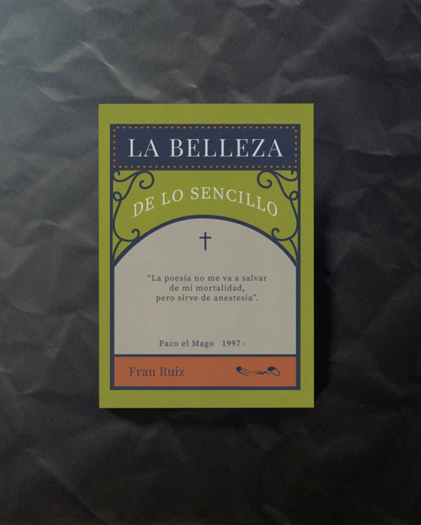 Empezamos por La belleza de lo sencillo. Es un poemario en el que intento escapar de mi yo anterior (por eso en la portada sale la tumba de Paco el Mago, y firmo el libro como Fran Ruiz). Intento empezar a hablar de temas diferentes a los que hablaba antes para huir de ellos. Miedos gigantes, inseguridades sin resolver, problemas trascendentales, existencialismos… Me paso el día escribiendo sobre cosas, entonces si empiezo a escribir sobre cosas pequeñas, más simples y más sencillas, tal vez deje de pensar en movidas tan aparatosas. Empiezo a escribir en el móvil, huyendo de la seriedad del ordenador, y además todo en minúsculas.